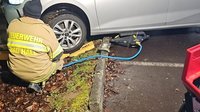 Um weiteren Schaden zu vermeiden, wurde das Fahrzeug behutsam mit Hebekissen angehoben und mit Holz untergebaut. Anschließend konnte der PKW vorsichtig rückwärts aus seiner misslichen Lage befreit werden.